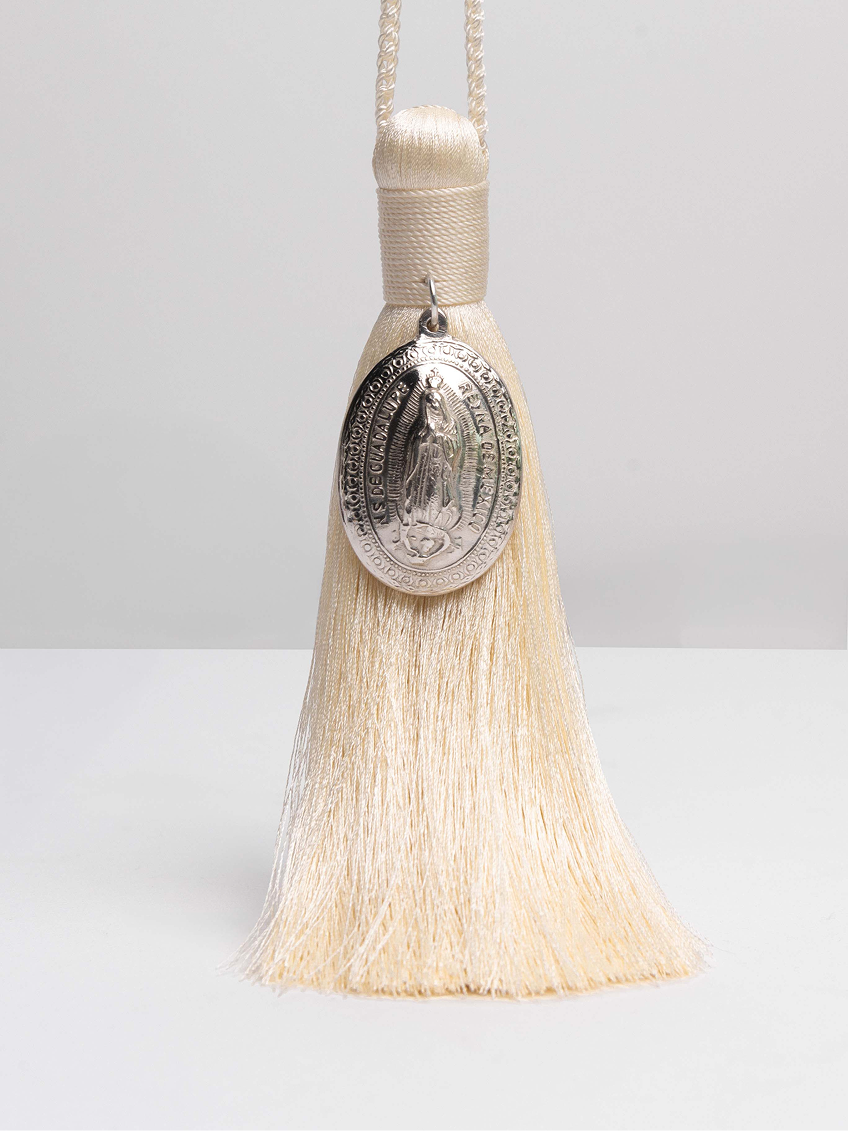 Bendición de Hogar chica con medalla de Virgen de Guadalupe. Medalla de 5 cm con baño de plata y borla de hilos de seda de 26 cm de largo. Incluye caja de acetato con oración.
