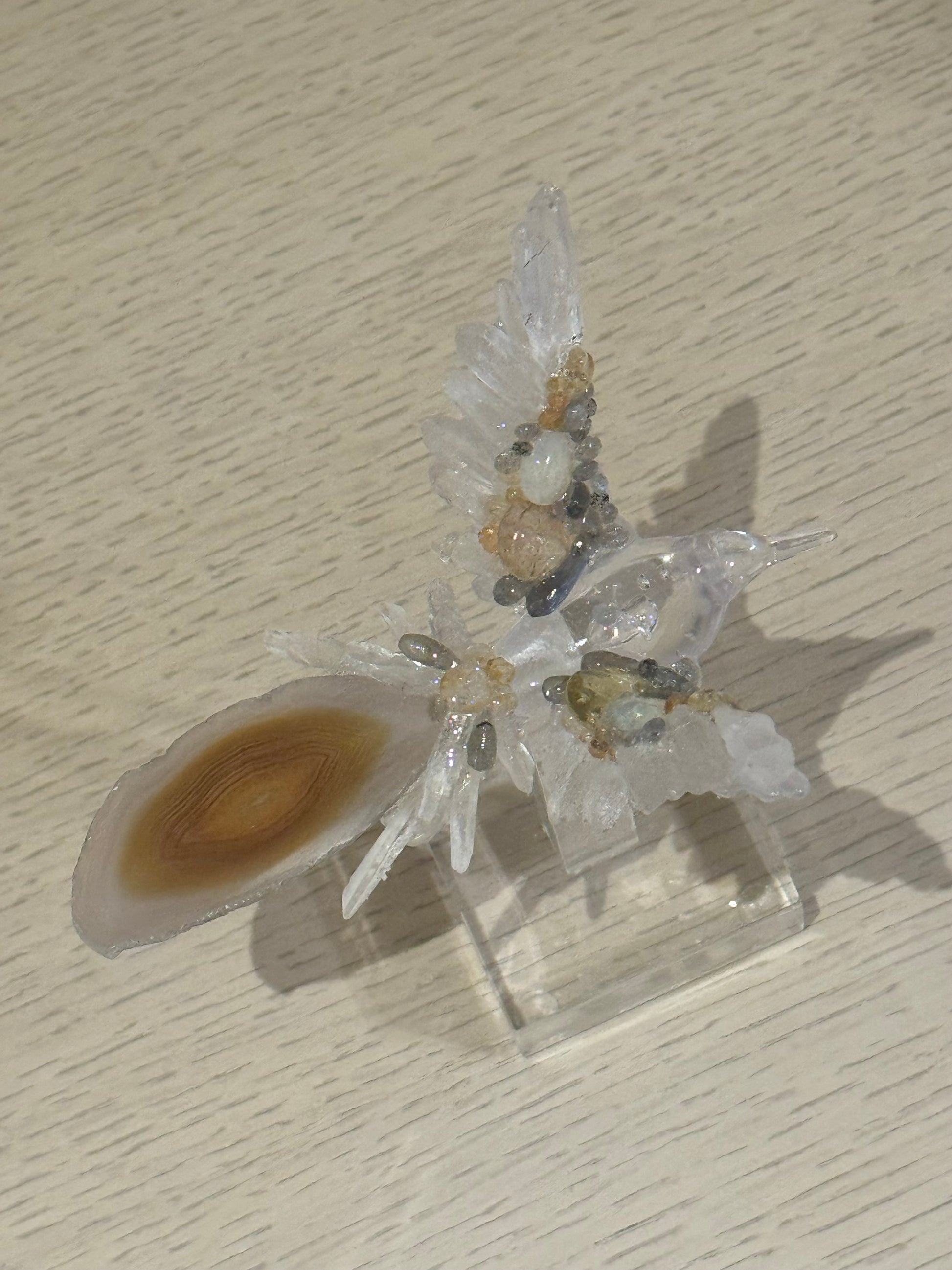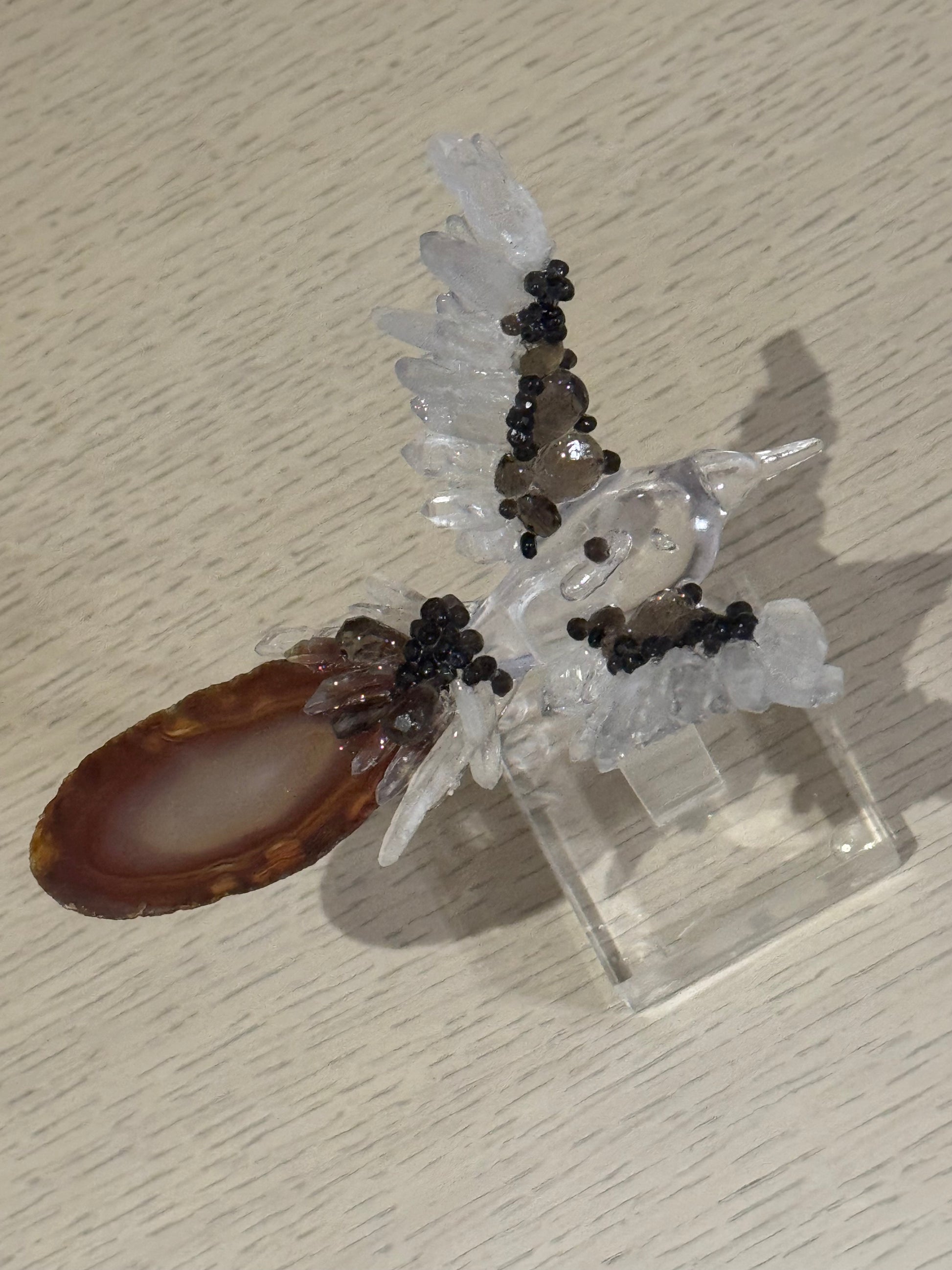 Colibrí con Cuarzos y Base de Acrílico