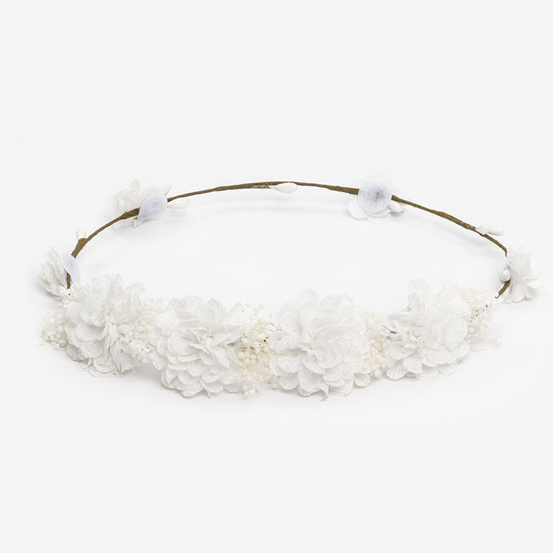 Corona con flores de tejido fino y flor seca natural. Color blanca. Ideal como complemento para primera comunión. Hecho artesanalmente en España.