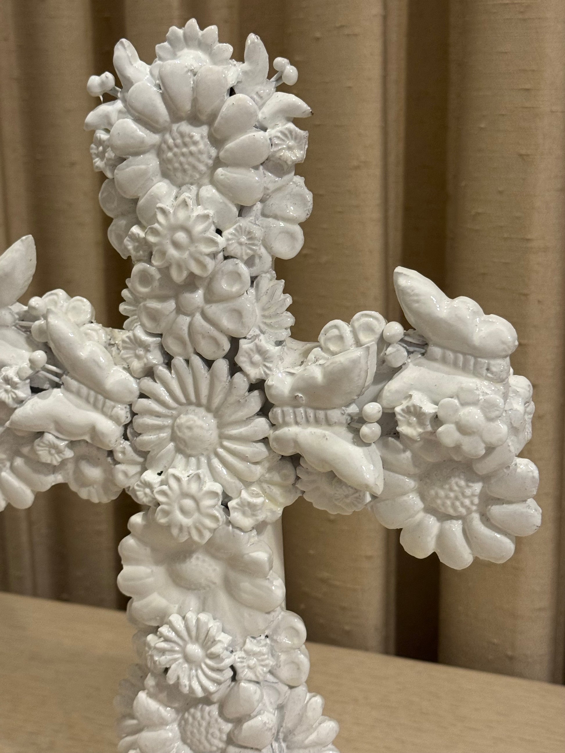 Cruz artesanal de barro vidriado en color blanco. Cruz decorada con flores y mariposas, hecha a mano y con terminado en esmalte vidriado. Altura: 30 cm.