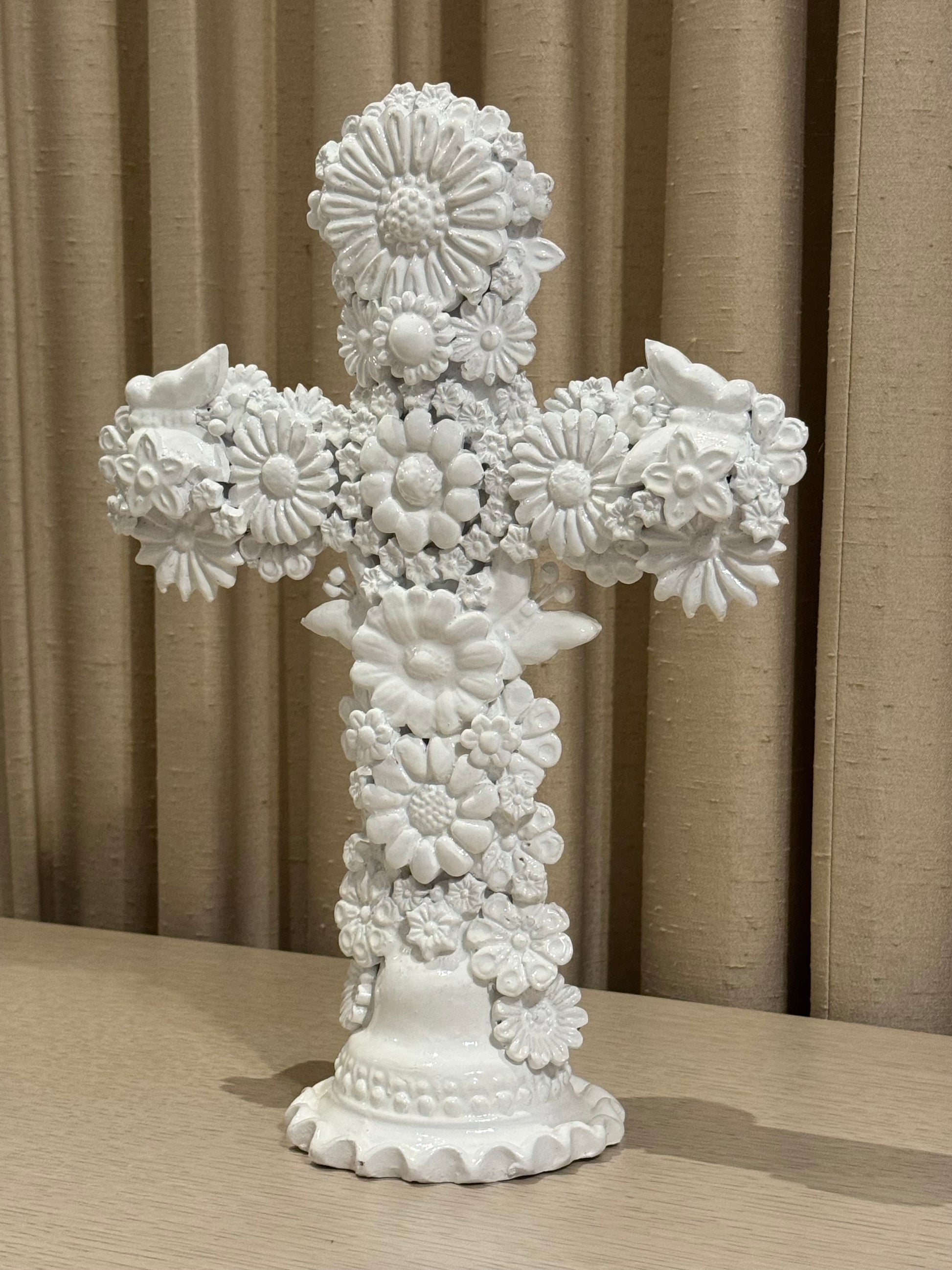 Cruz artesanal de barro vidriado en color blanco. Cruz decorada con flores y mariposas, hecha a mano y con terminado en esmalte vidriado. Altura: 38 cm.