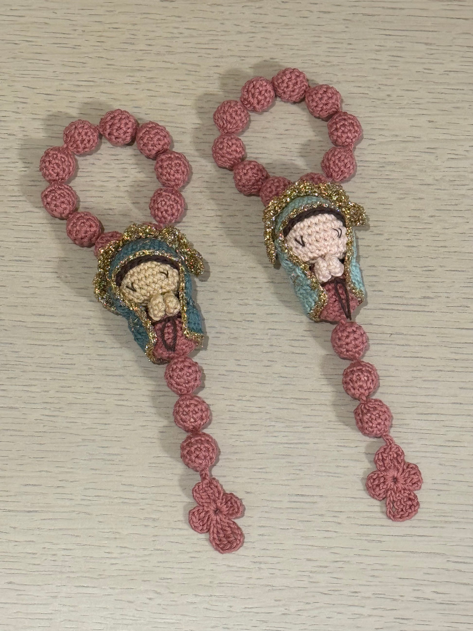 Decenario Crochet de Virgen de Guadalupe tejido completamente a mano. Largo de 40 cm. Un detalle lleno de significado, ideal como recuerdito para los que te acompañan en ese momento especial. Cada pieza está fabricada a mano por artesanos mexicanos.