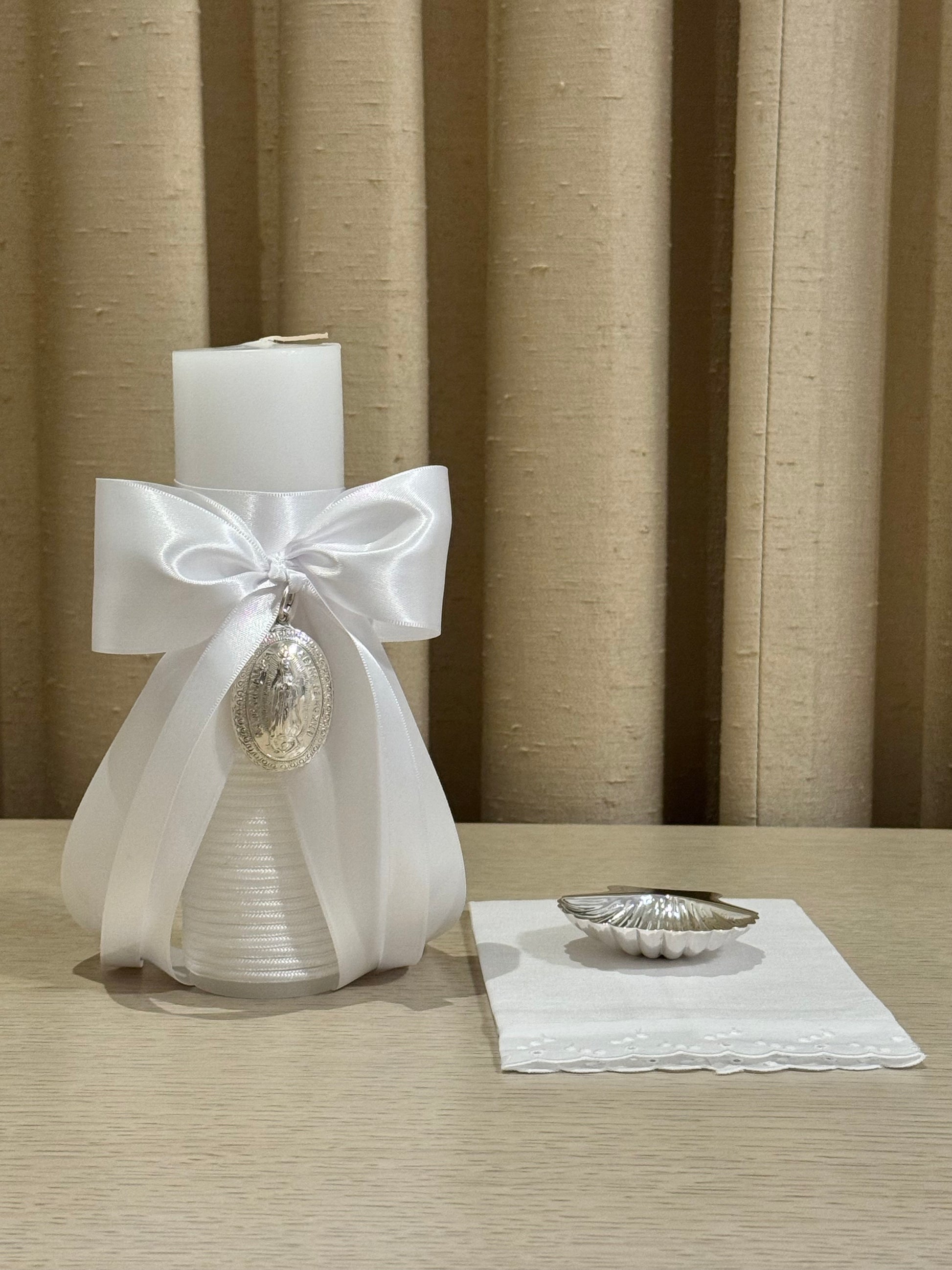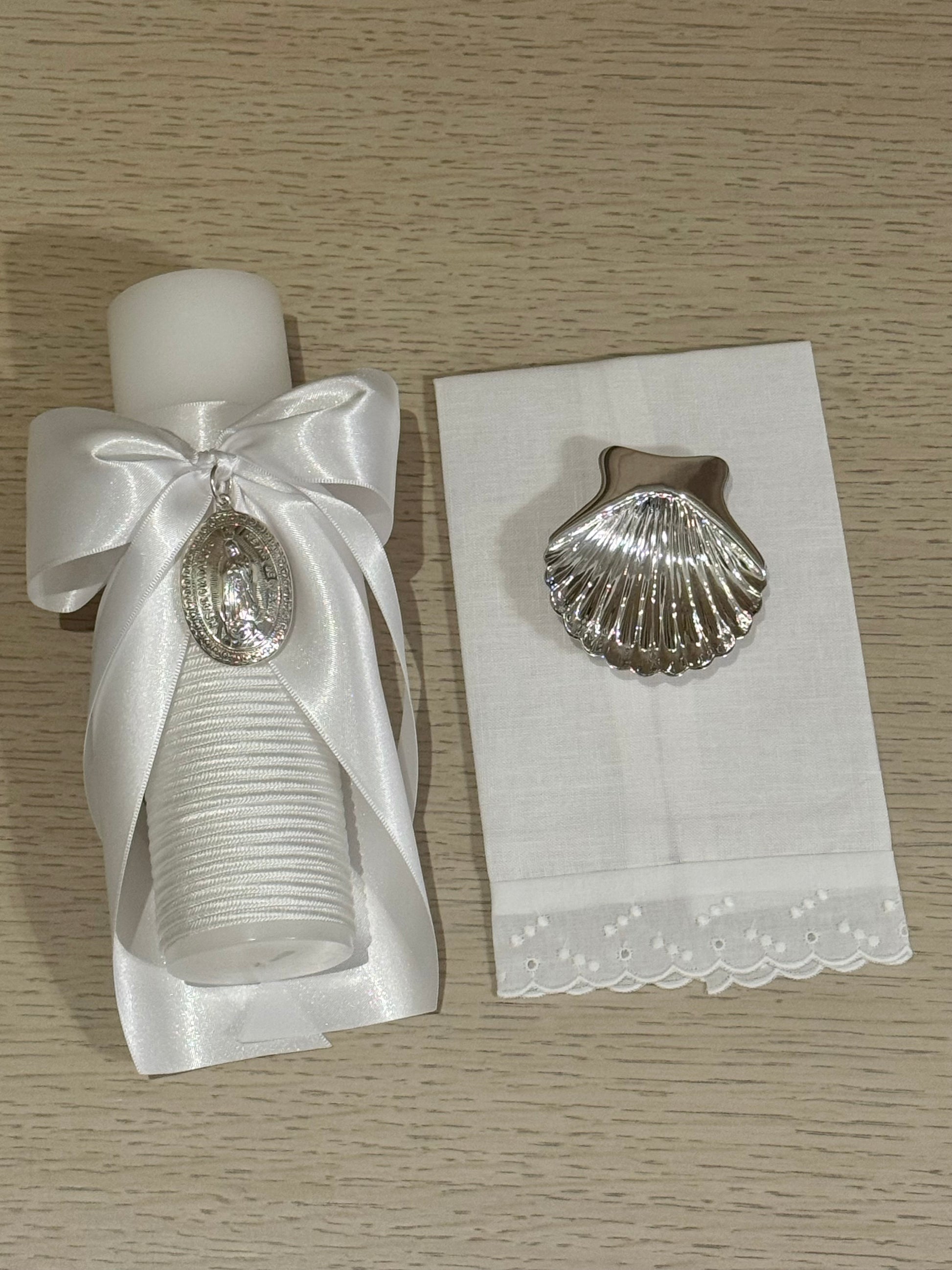 Set de Bautizo para esa ceremonia especial de tu bebé. Incluye: Vela forrada con moño y medalla de la Virgen de Guadalupe con baño de plata, toallita de lino con tira bordada y concha con baño de plata.