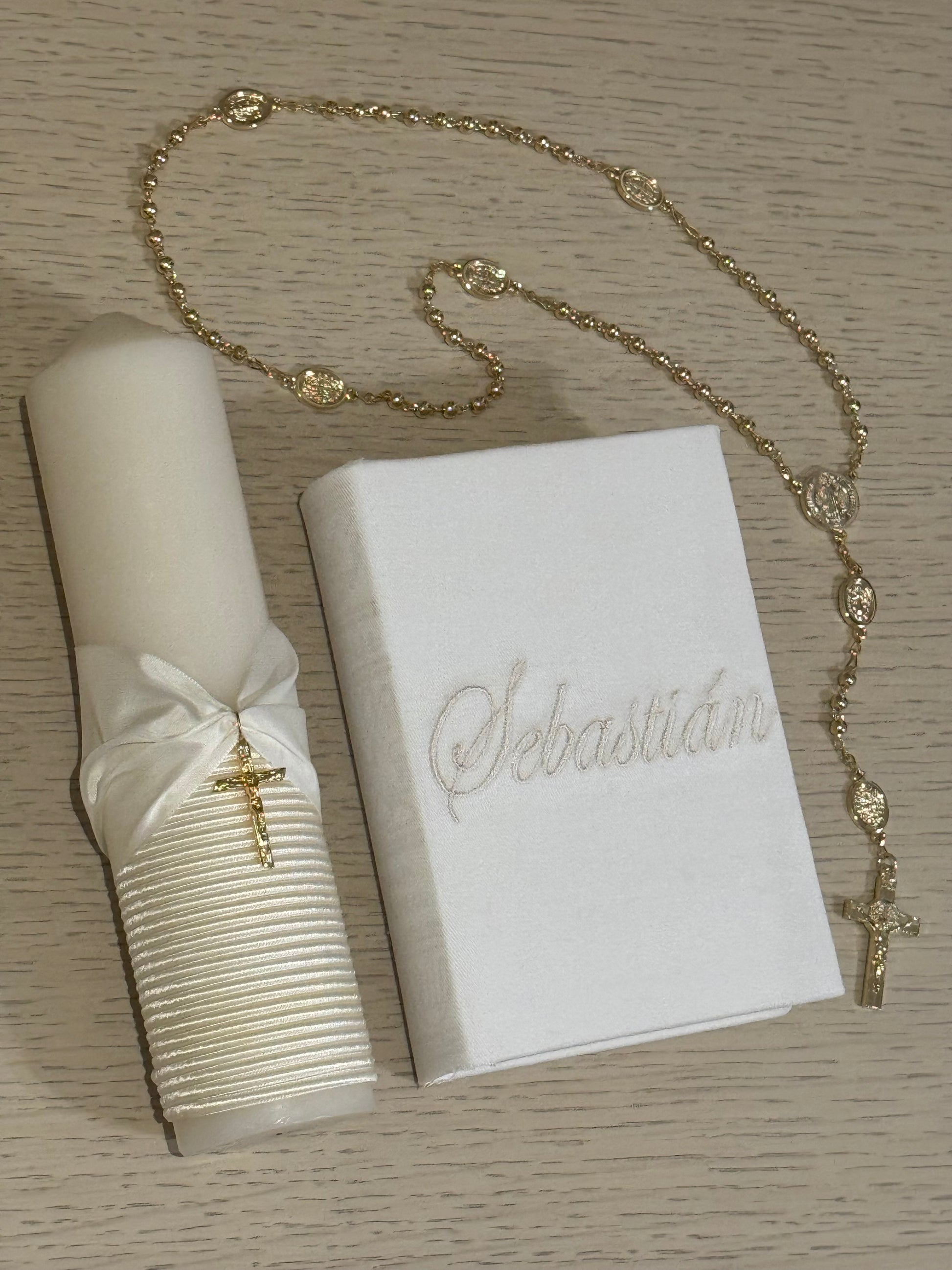 Set de Primera Comunión. Incluye: Vela con cruz dorada, Biblia forrada en tela y Rosario.