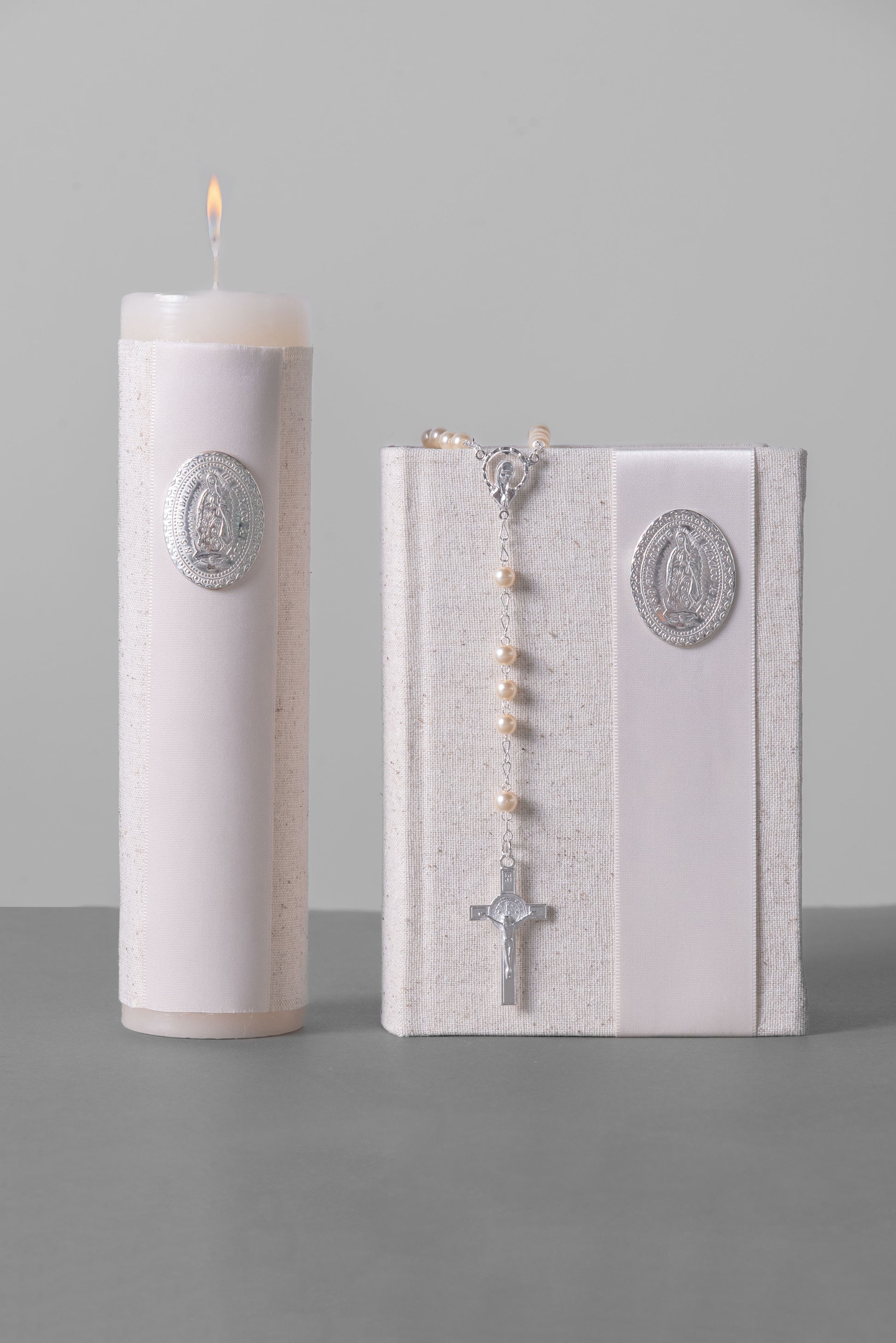 Set de Primera Comunión de Virgen de Guadalupe. Incluye: Vela y Biblia forrada en lino con medalla de Virgen de Guadalupe; y Rosario.