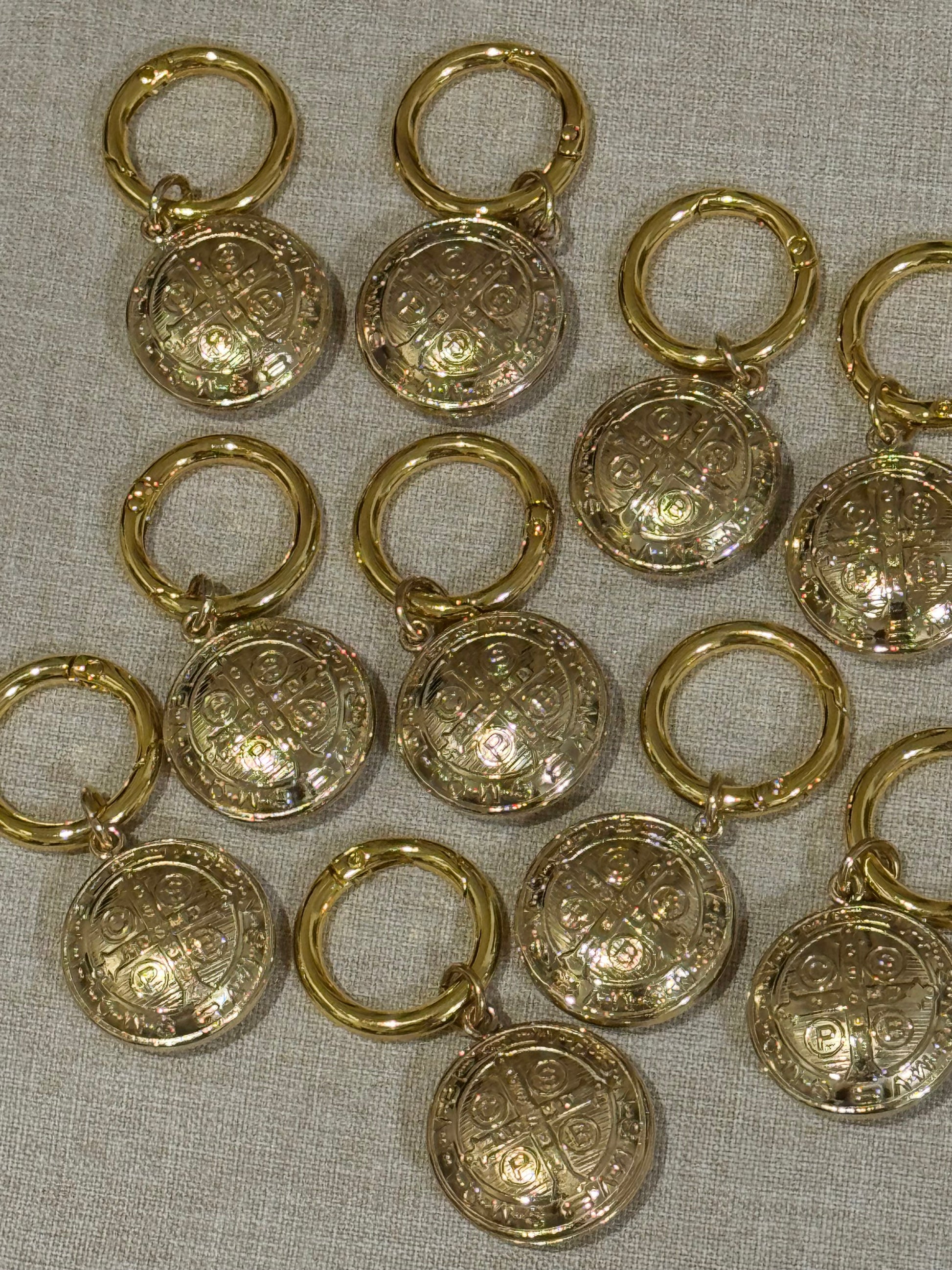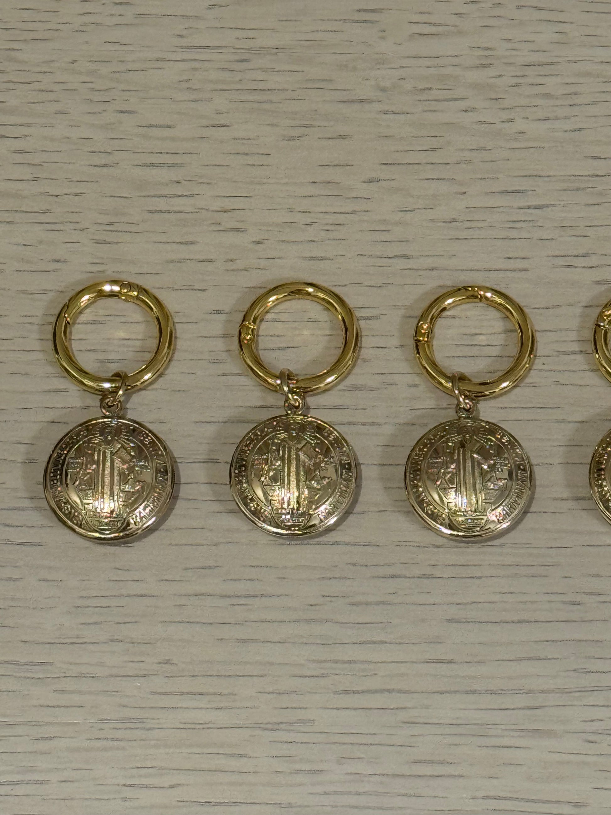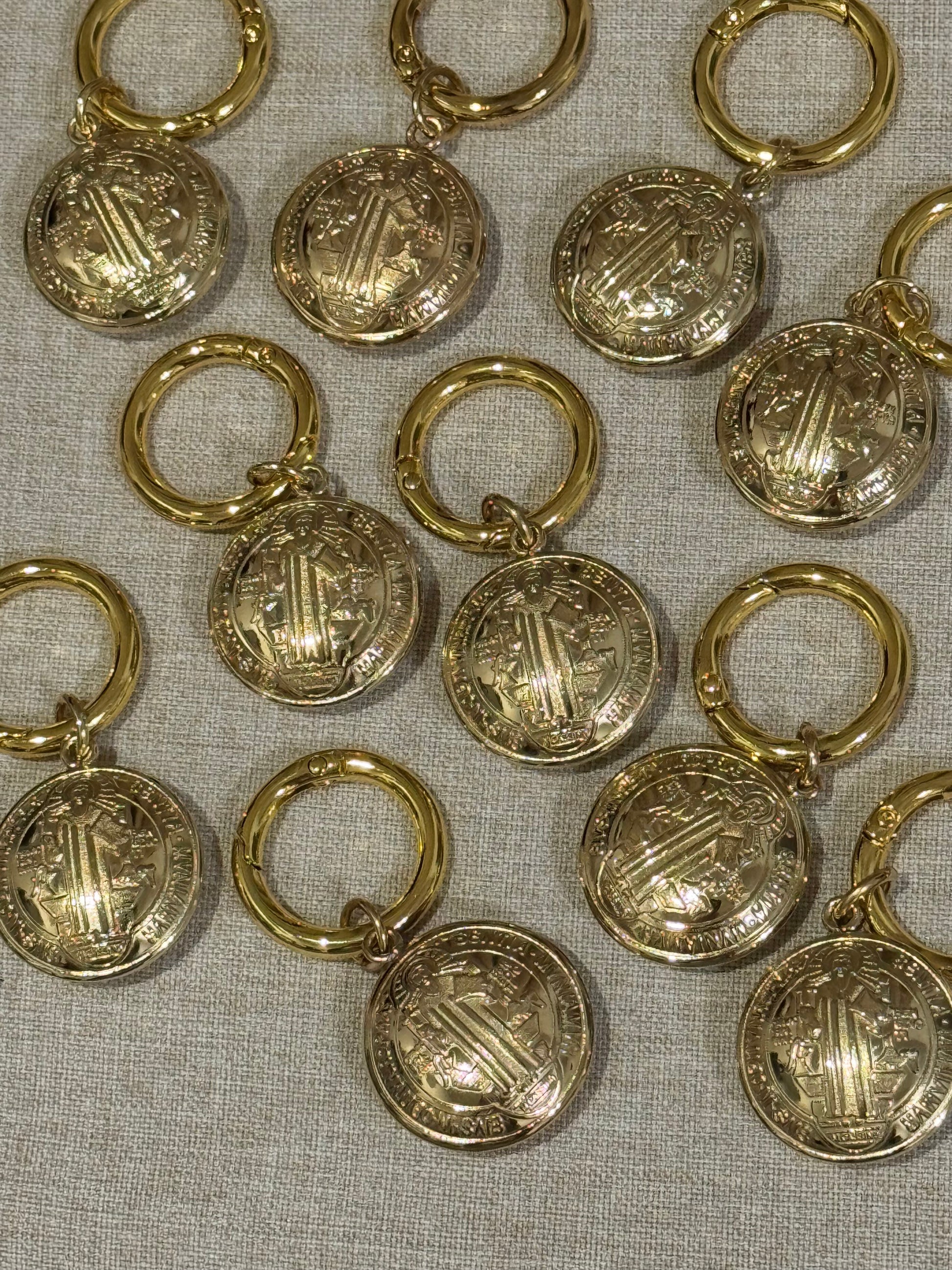Llavero de San Benito de latón (dorado), doble vista. Diametro 2.8 cm. Un detalle lleno de significado, ideal como recuerdito para los que te acompañan en ese momento especial.