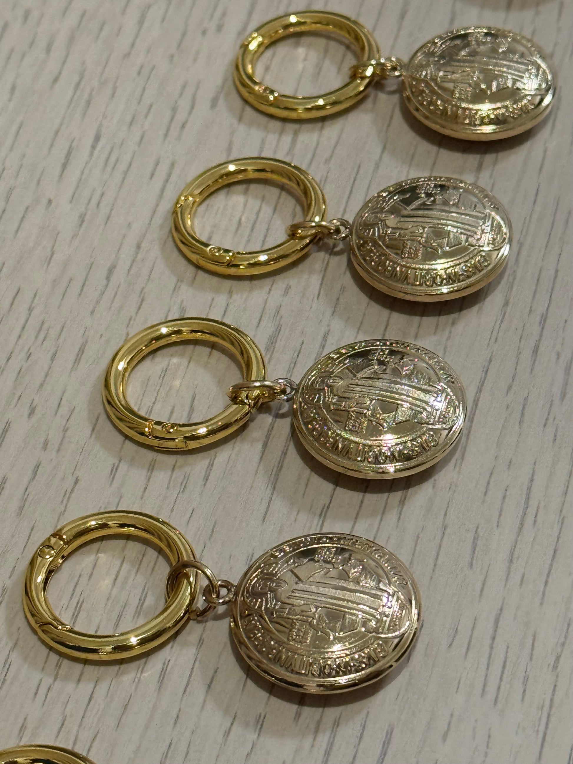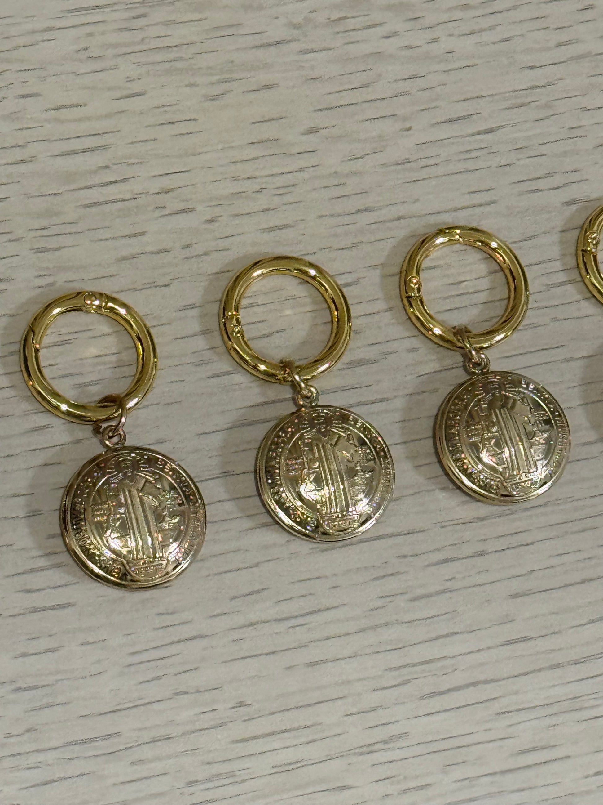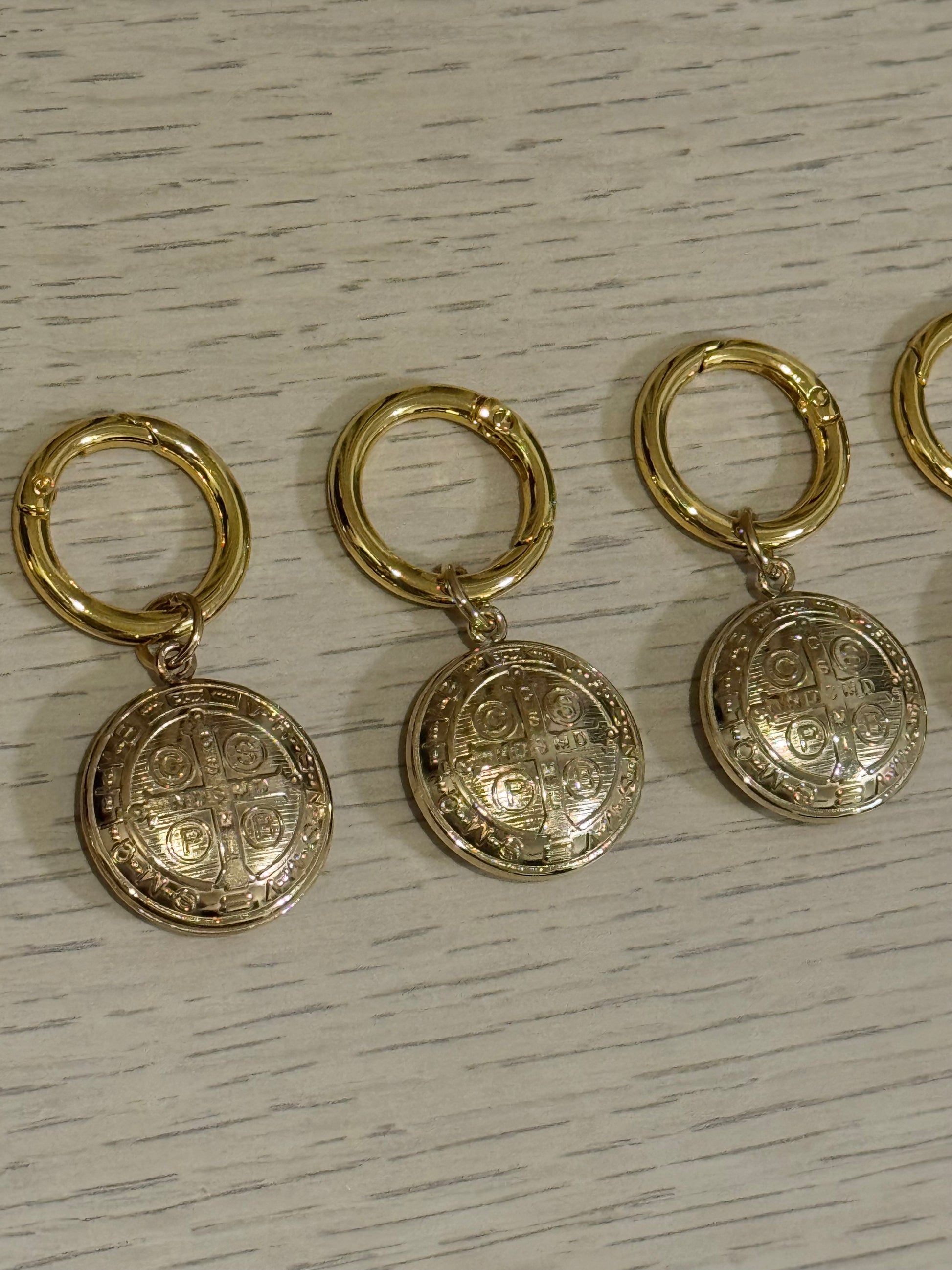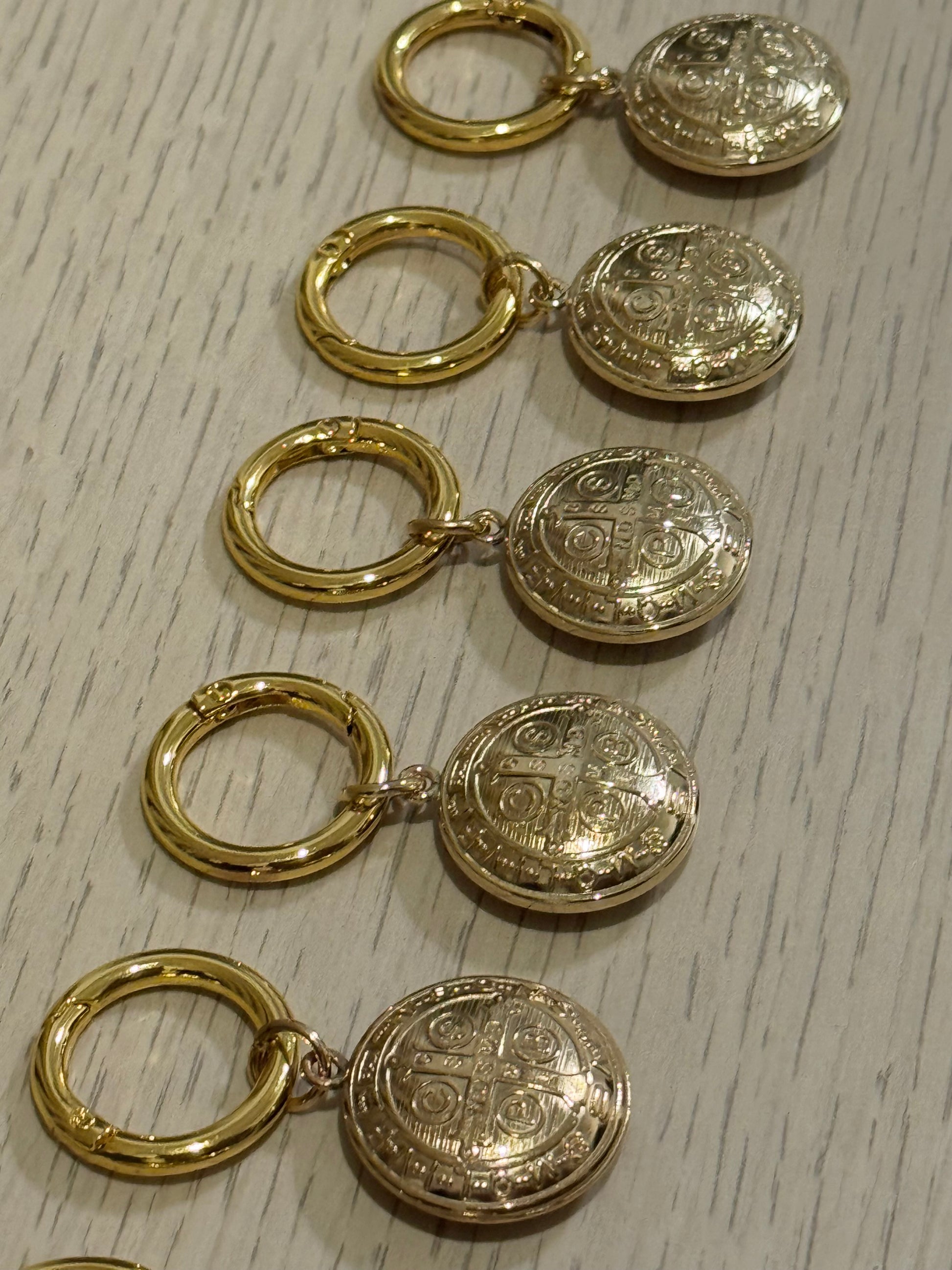Llavero de San Benito de latón (dorado), doble vista. Diametro 2.8 cm. Un detalle lleno de significado, ideal como recuerdito para los que te acompañan en ese momento especial.