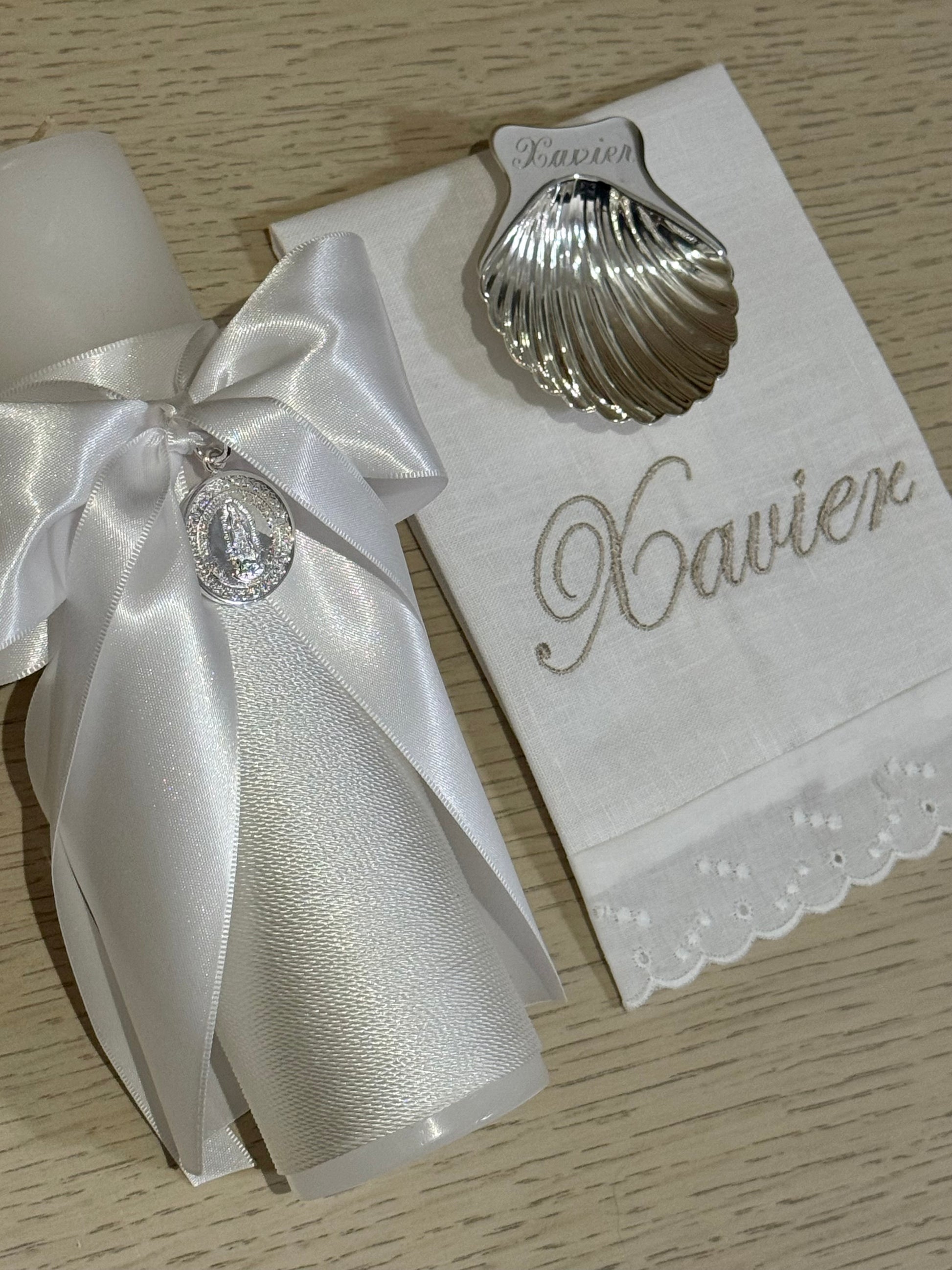 Set de Bautizo para esa ceremonia especial de tu bebé. Incluye: Vela forrada con moño y medalla de la Virgen de Guadalupe con baño de plata, toallita de lino con tira bordada y concha con baño de plata.
