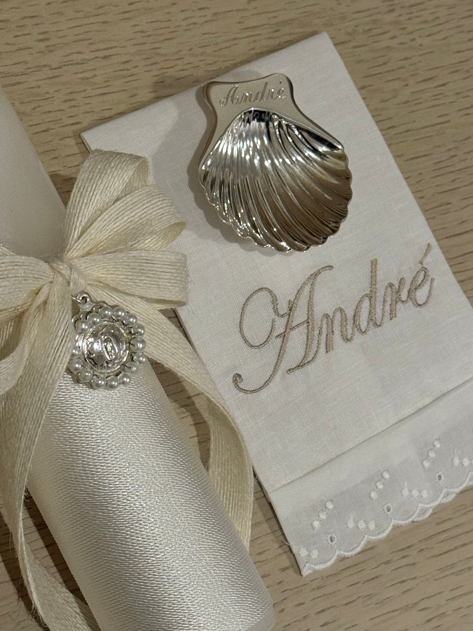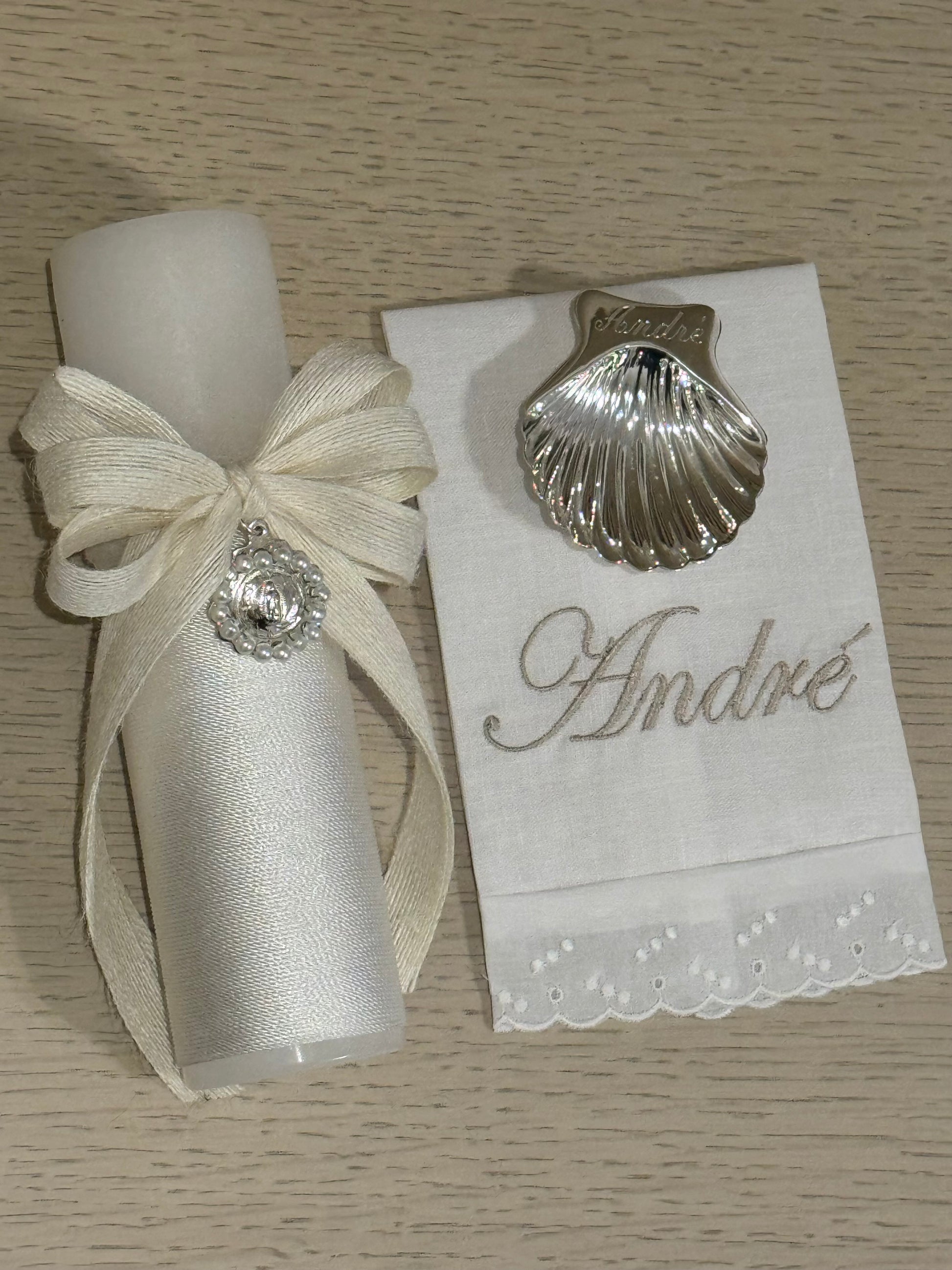 Set de Bautizo para esa ceremonia especial de tu bebé. Incluye: Vela forrada con moño y medalla de la Virgen de Guadalupe con baño de plata, toallita de lino con tira bordada y concha con baño de plata.