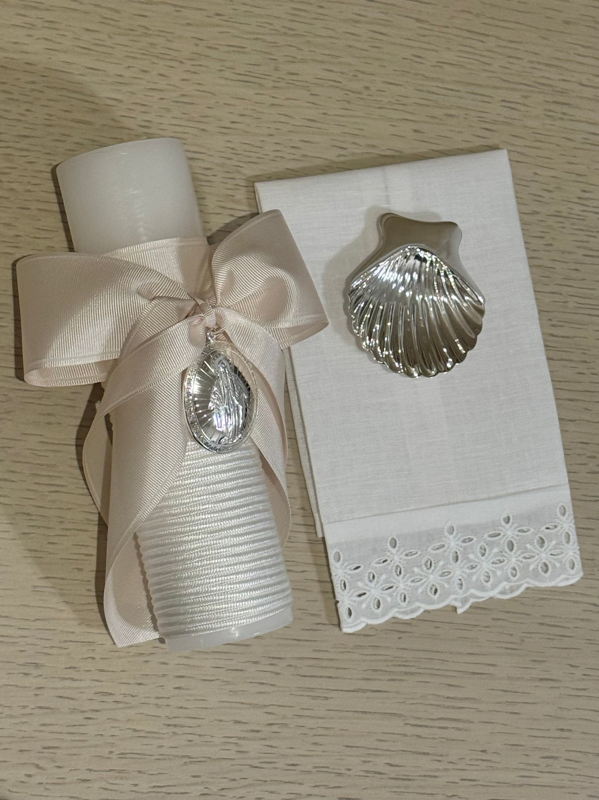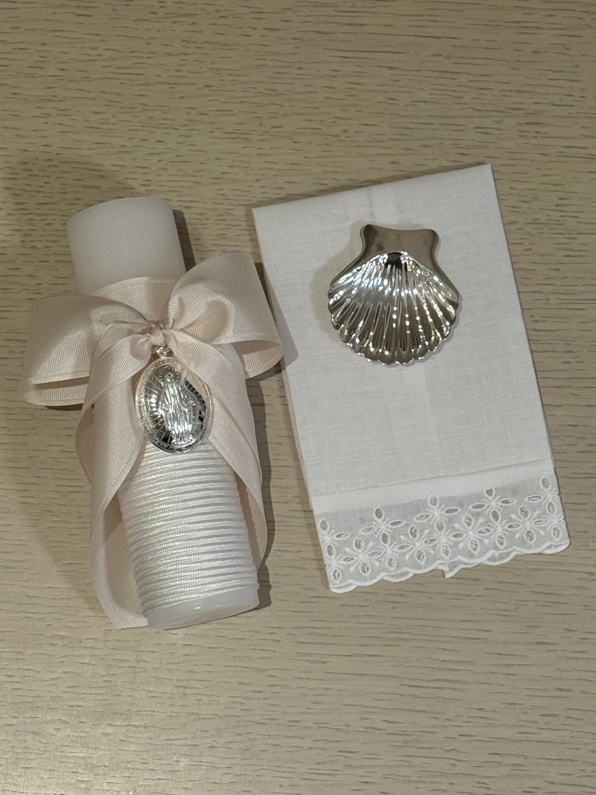 Set de Bautizo para esa ceremonia especial de tu bebé. Incluye: Vela forrada con moño y medalla de la Virgen Milagrosa con baño de plata, toallita de lino con tira bordada y concha con baño de plata.