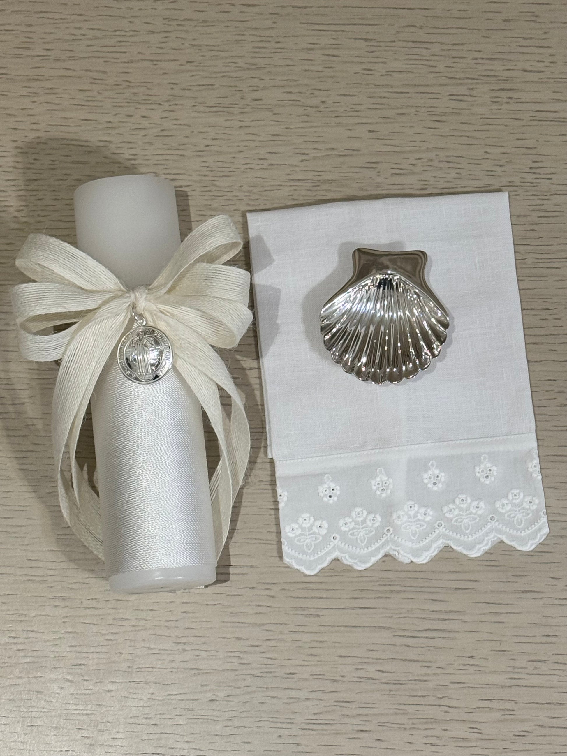 Set de Bautizo para esa ceremonia especial de tu bebé. Incluye: Vela forrada con moño y medalla de San Benito con baño de plata, toallita de lino con tira bordada y concha con baño de plata.