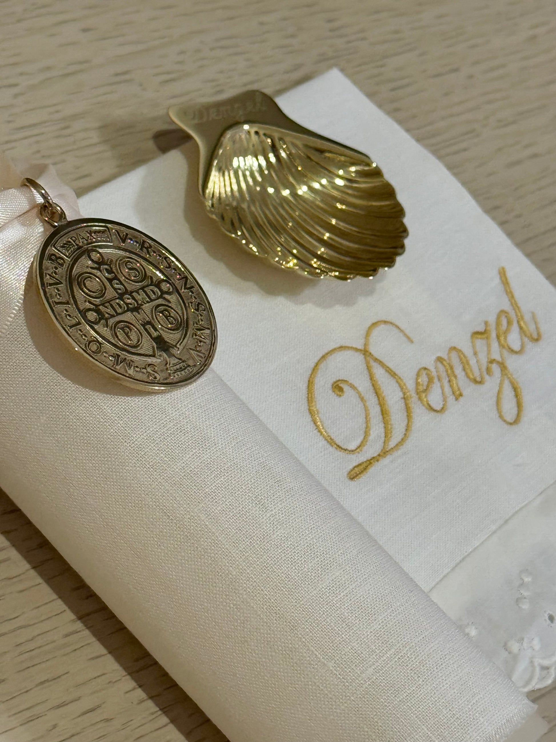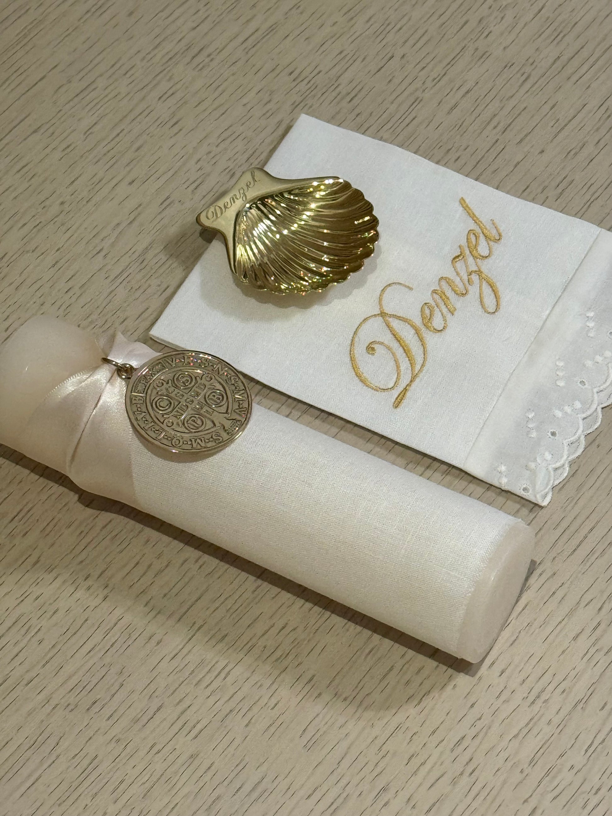 Set de Bautizo para esa ceremonia especial de tu bebé. Incluye: Vela forrada con lino y medalla de San Benito, toallita de lino con tira bordada y concha de latón con acabado dorado.