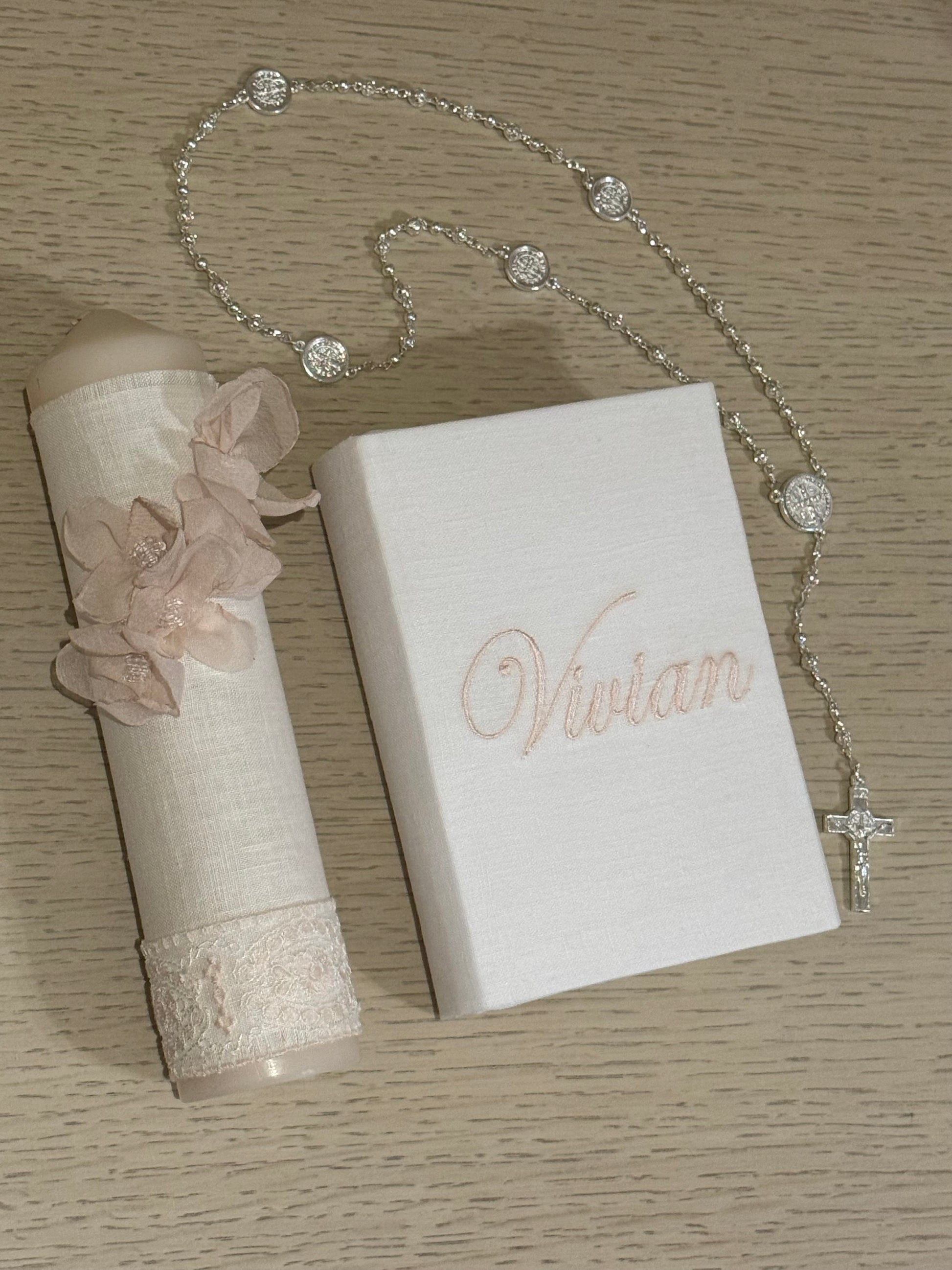 Set de Primera Comunión. Incluye: Vela con flores, Biblia forrada en lino y Rosario.