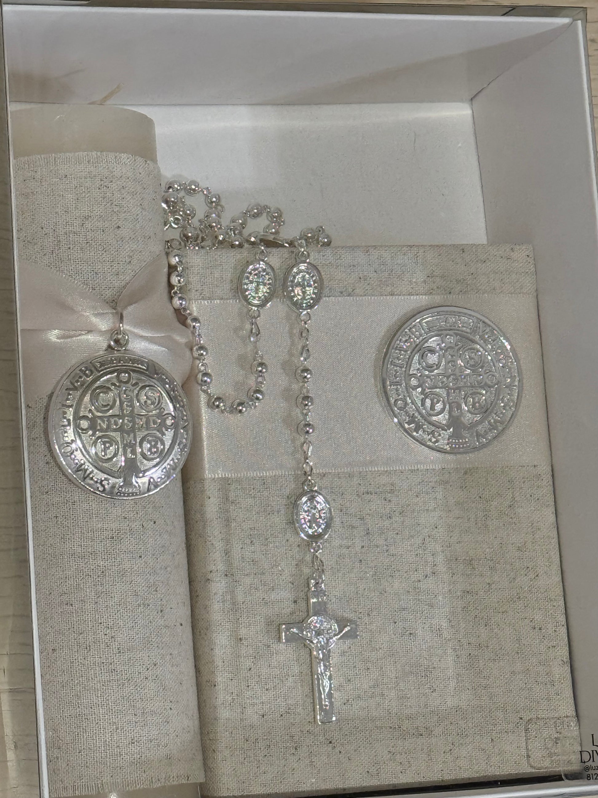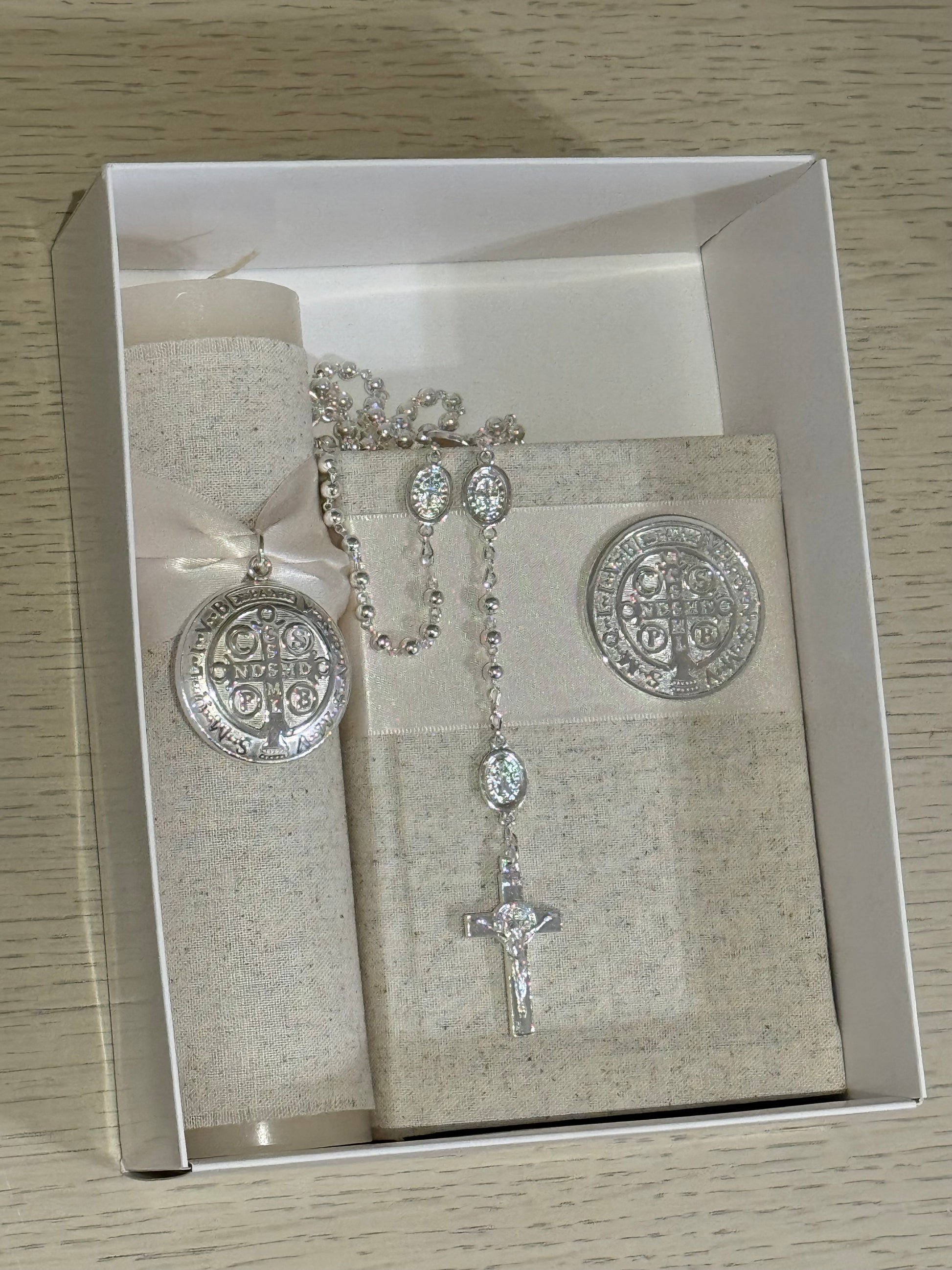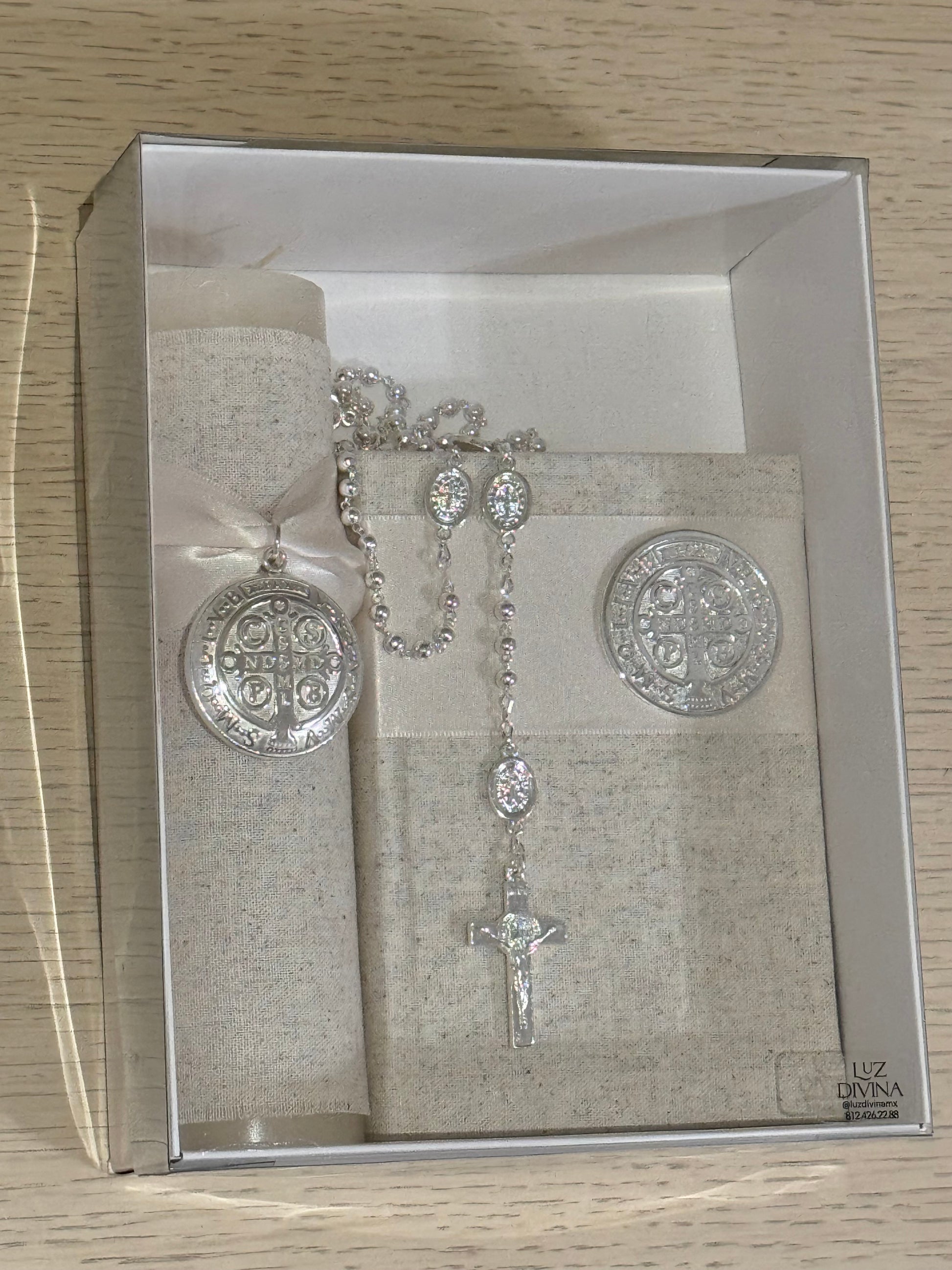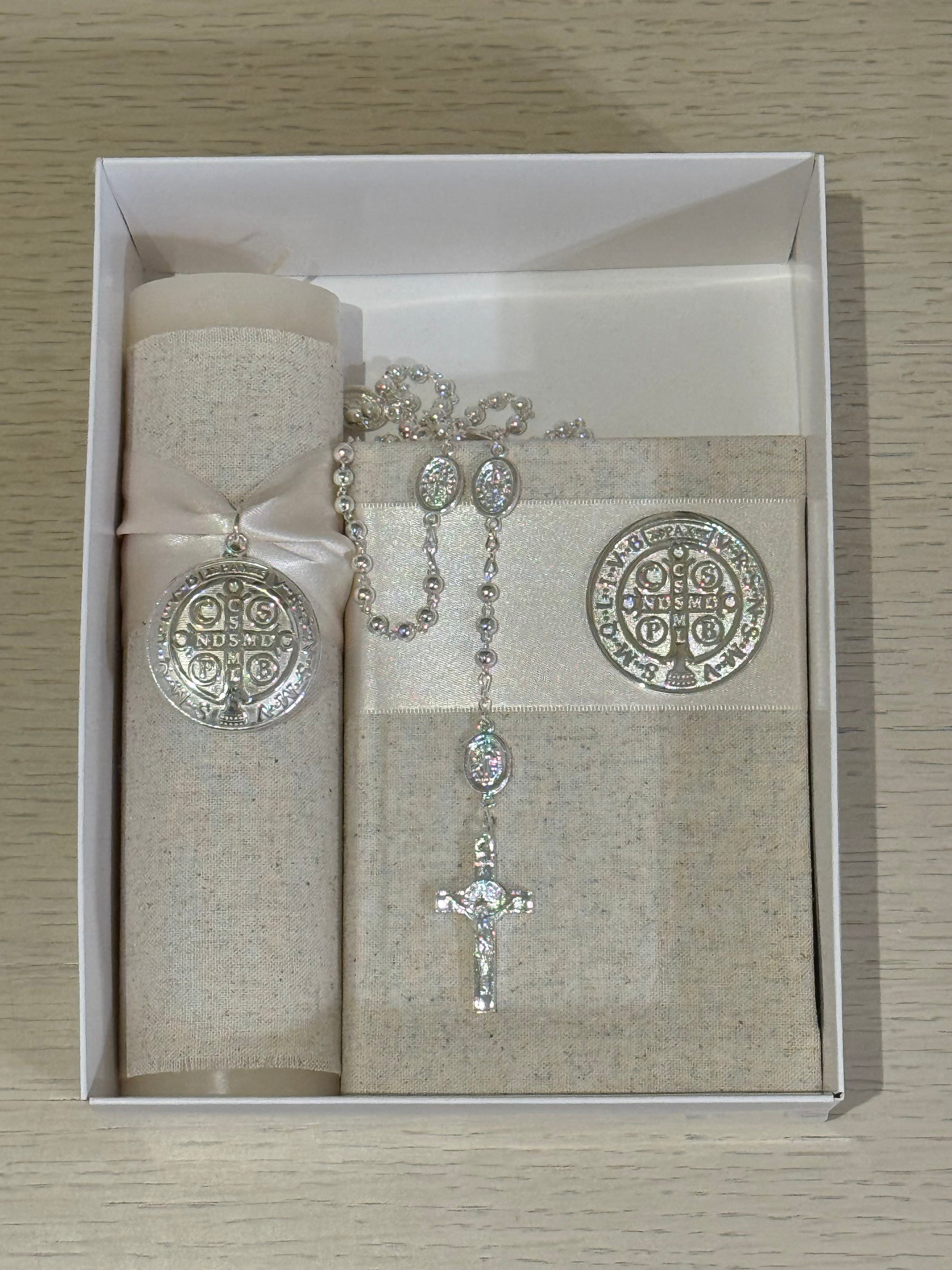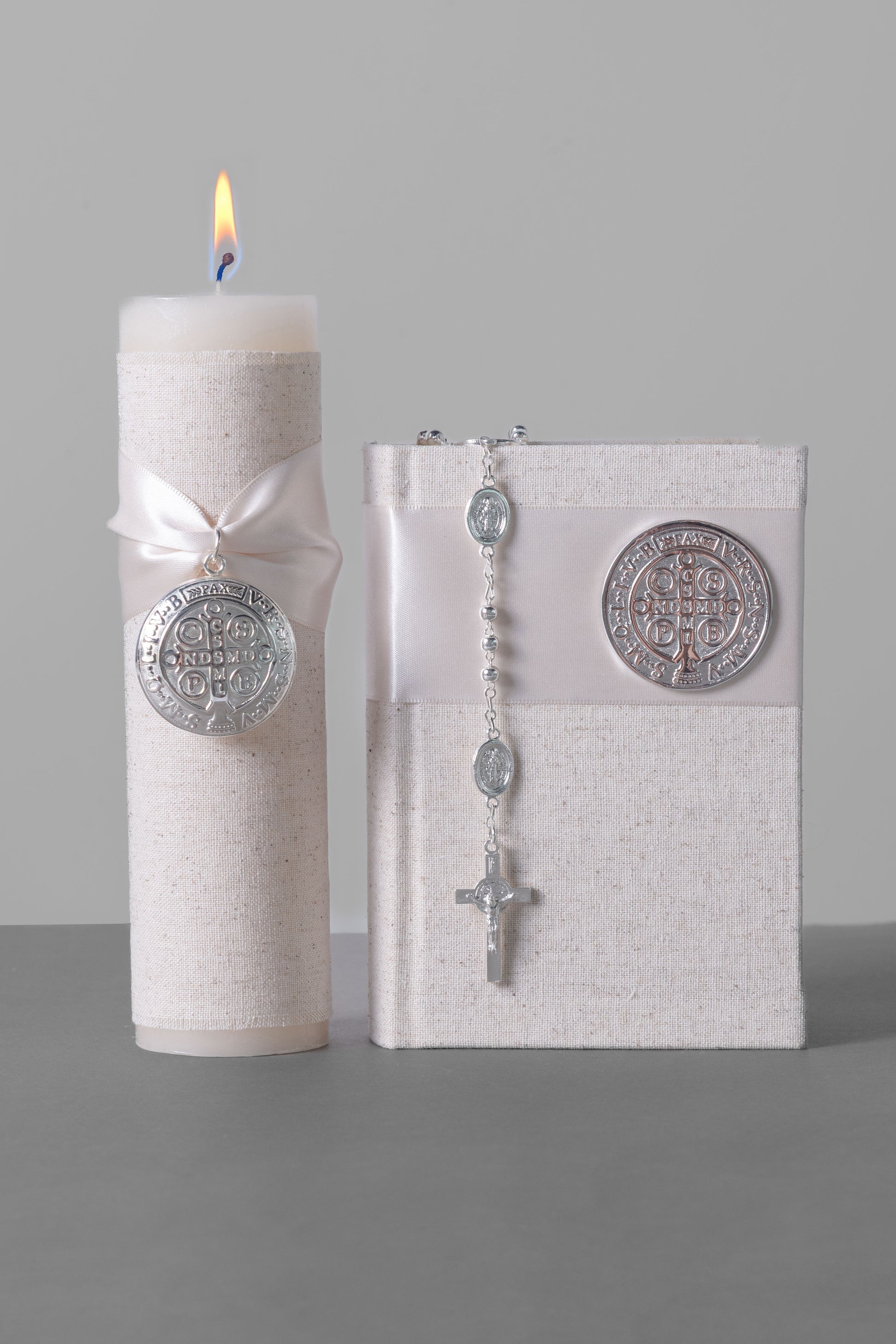Set de Primera Comunión de San Benito. Incluye: Vela y Biblia forrada en lino con medalla de San Benito; y Rosario.