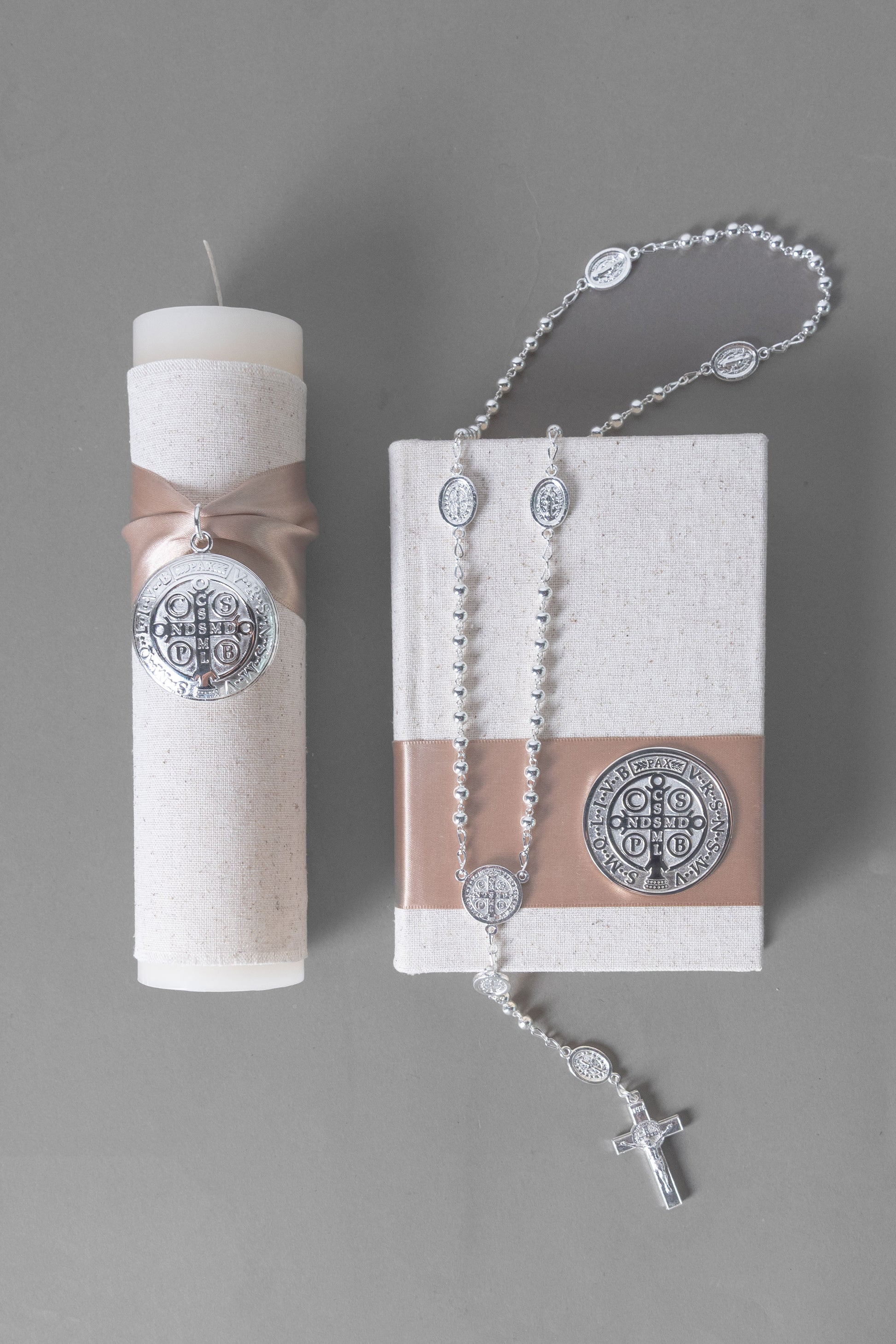 Set de Primera Comunión de San Benito. Incluye: Vela y Biblia forrada en lino con medalla de San Benito; y Rosario.
